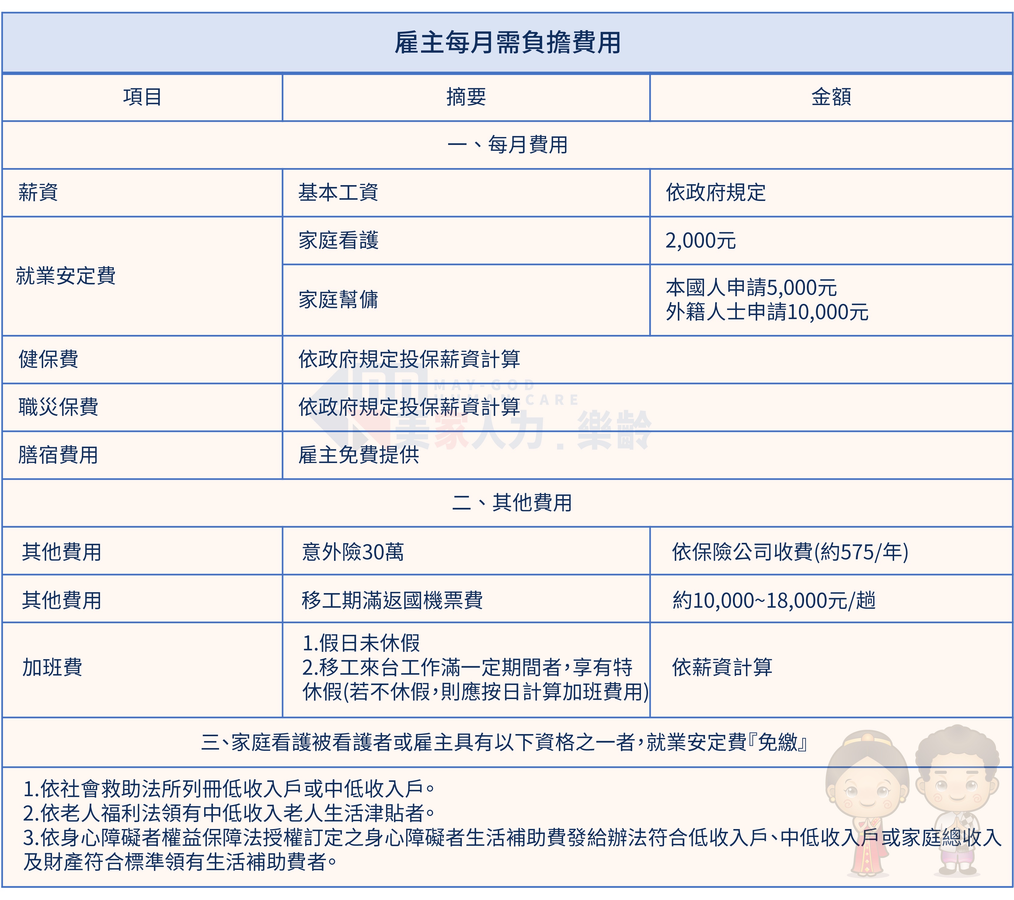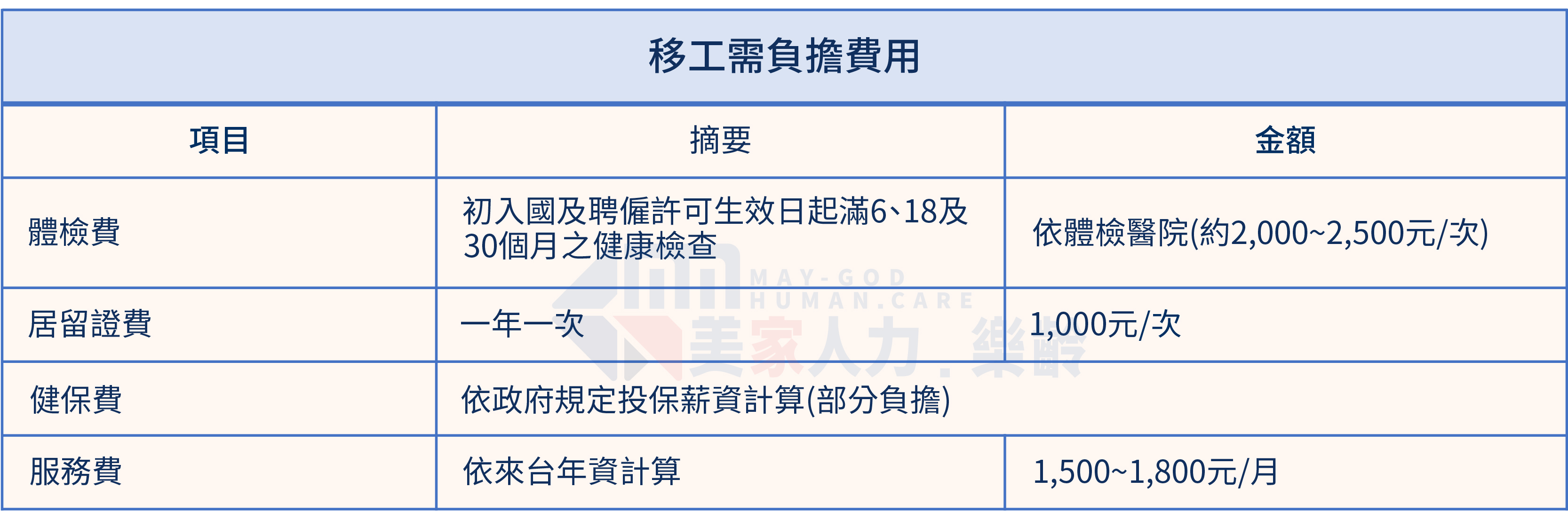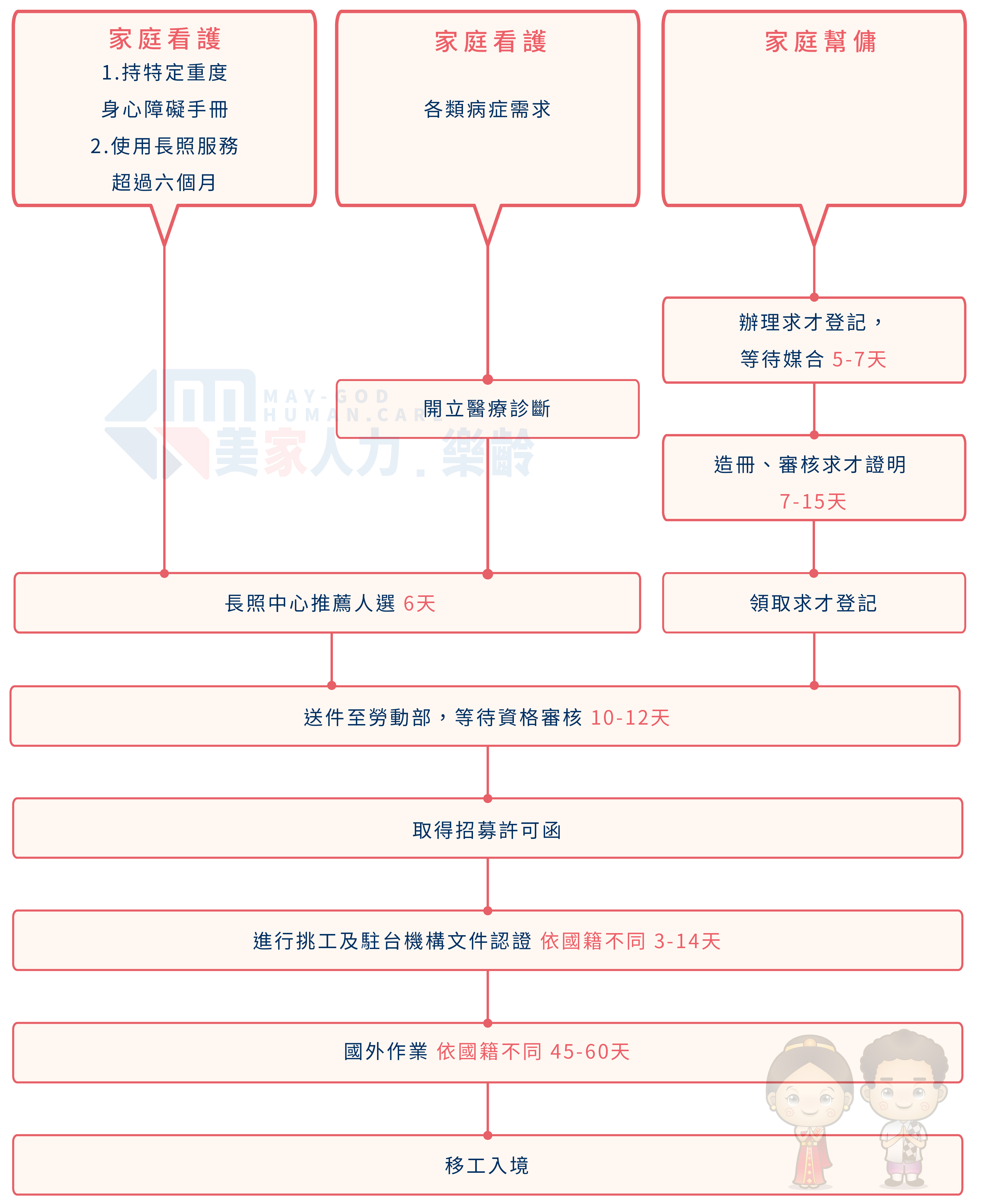協助家庭引薦優質外籍看護與幫傭,美家人力秉持服務精神,從求才到交工一手包辦,交工後也持續關懷協助您處理移工相關事宜。並在移工到職後提供照顧指導服務,專業團隊到府協助指導外籍看護,使家人得到完善的照顧,讓雇主能安心放心。美家人力收費公開透明,不收取規定外的費用,服務區域涵蓋本島,是您照顧家人的最佳夥伴!